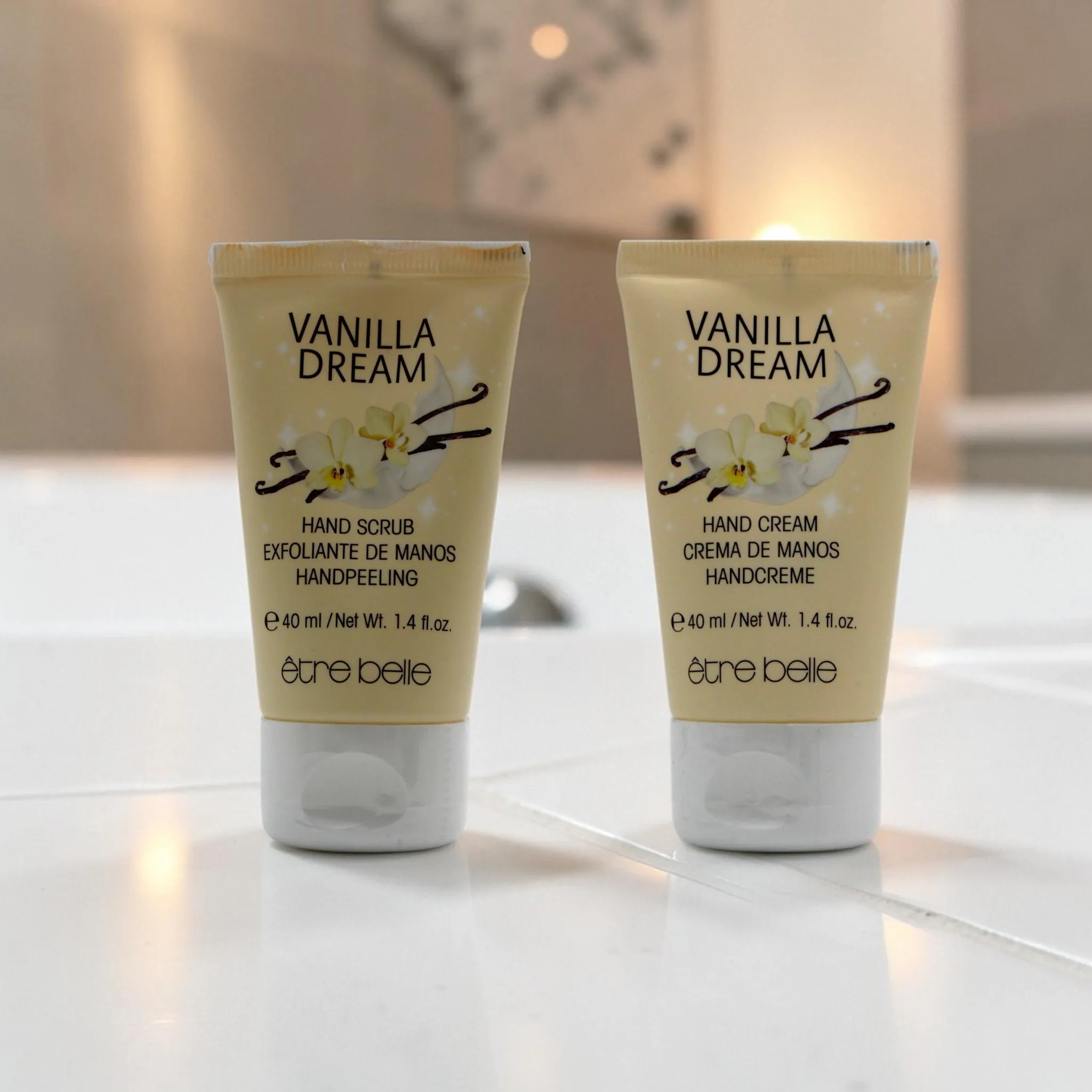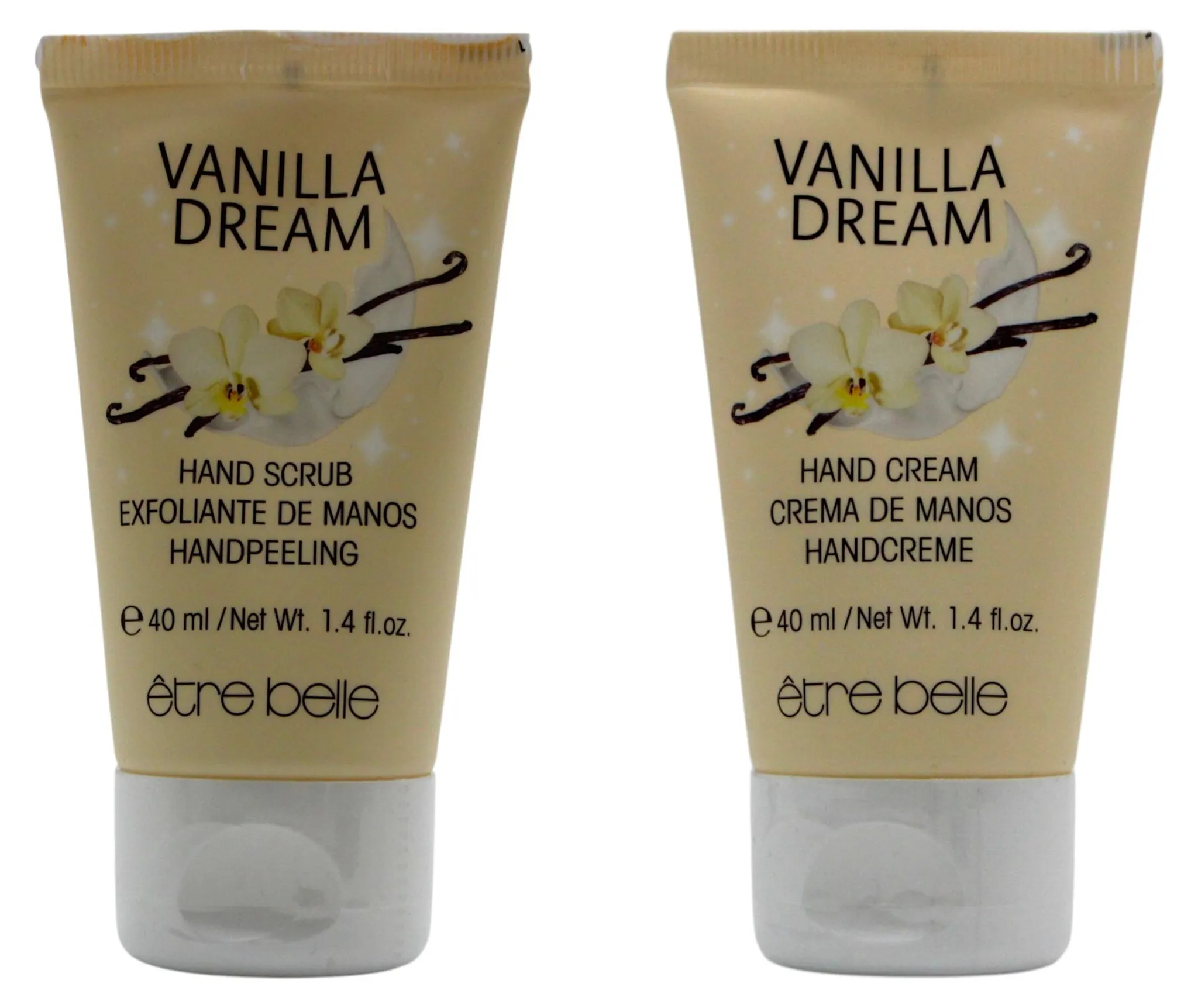 The Etre Belle Vanilla Dream Hand Care Set combines gentle exfoliation and intensive moisturization in a perfectly coordinated duo for silky-soft hands. The set includes a Vanilla Dream Hand Scrub (40 ml) and a Vanilla Dream Hand Cream (40 ml), offering a complete hand care routine.