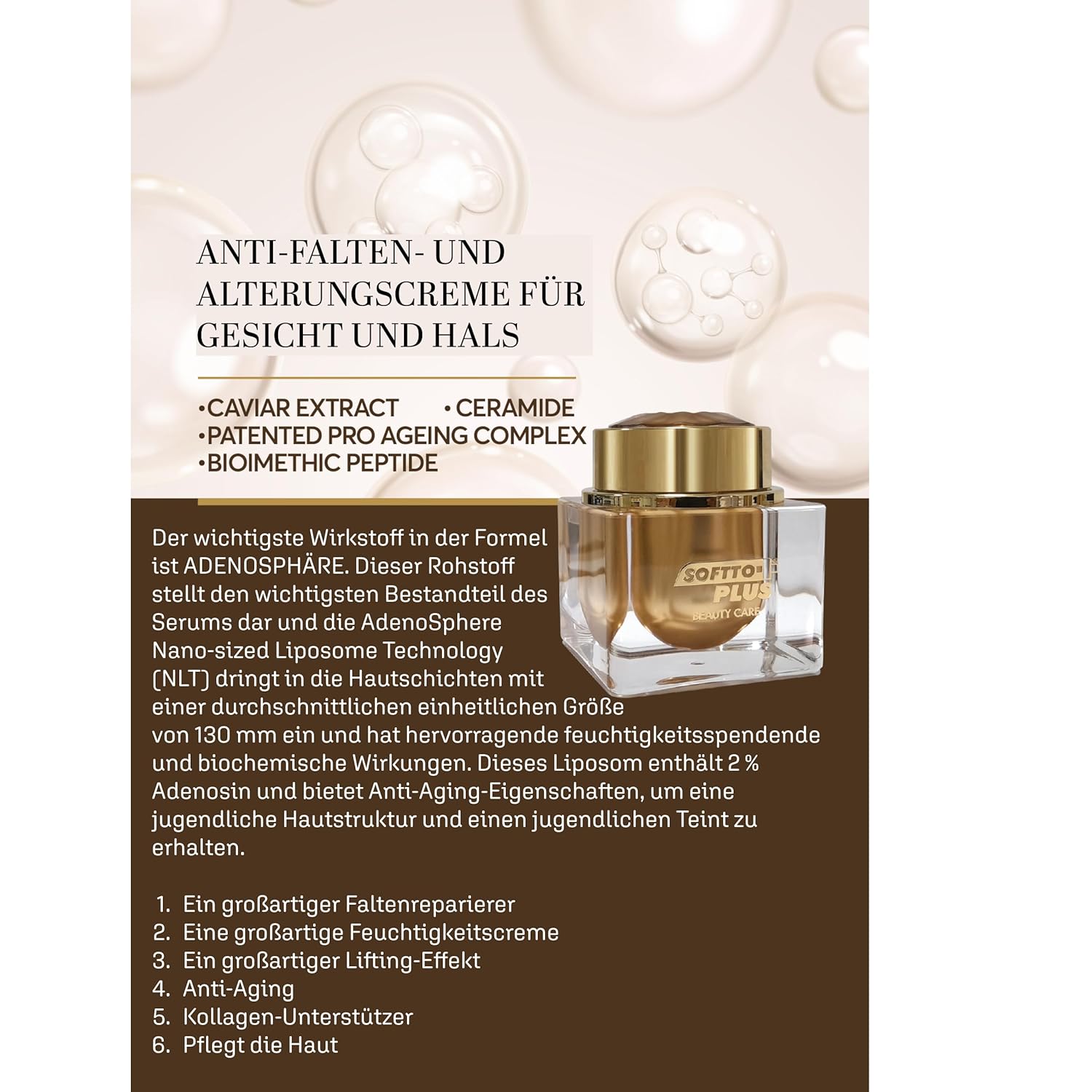 Over time, the skin loses elasticity, becomes thinner and shows the first signs of wrinkling. Targeted care is crucial to slow down this natural ageing process. The Softto+Plus 360° Pro-Ageing Face & Neck Cream was developed to combat all visible signs of ageing and regenerate the skin on the face and neck. The special formula of this cream supports cell renewal by supplying the skin with valuable nutrients and accelerating the skin's natural repair mechanisms. The skin becomes noticeably firmer and more elastic, reducing the appearance of wrinkles and fine lines. With regular use, the complexion improves noticeably and the skin appears fresher, smoother and younger. This cream offers intensive care, particularly in the sensitive neck and décolleté area, where the skin is thinner and can form wrinkles more quickly. It strengthens the skin structure and protects against premature skin ageing. The 360° Pro-Ageing Face & Neck Cream is quickly absorbed without leaving any greasy residue and leaves the skin feeling velvety soft and comfortable. Thanks to its intensive anti-ageing effect, this cream is the ideal solution for firming, regenerating and rejuvenating the skin in the long term. It ensures that the skin on your face and neck remains youthful and firm as you age.