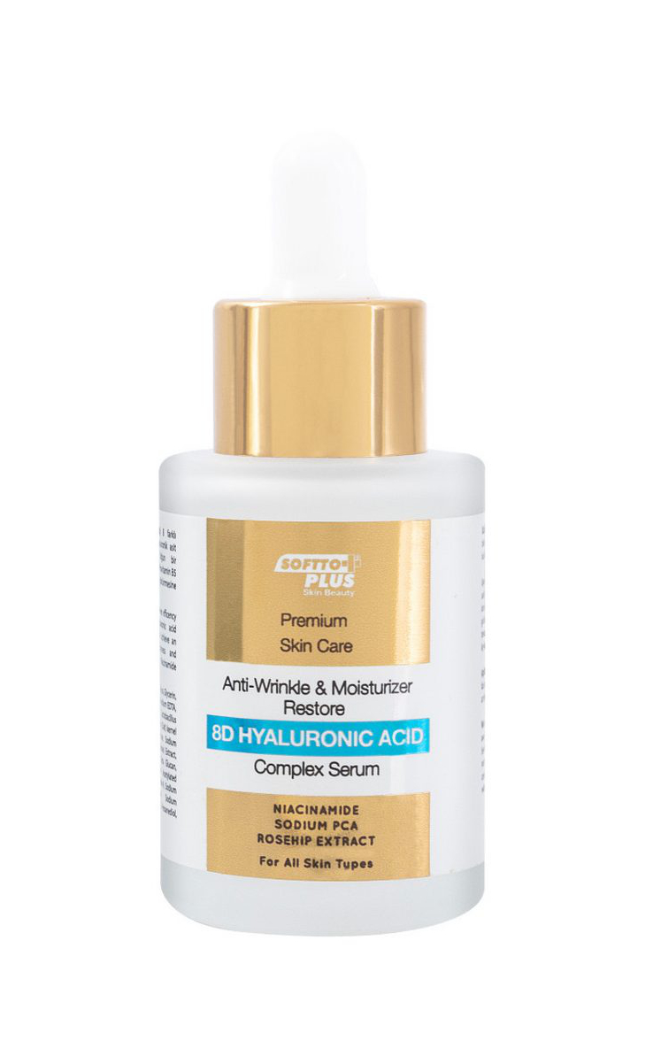 The Softto Plus 8D Hyaluronic Acid Complex Serum is specially formulated to intensively moisturize the skin and visibly improve its appearance. Thanks to the combination of 8 different hyaluronic acid molecules, moisture retention, elasticity and skin smoothness are maximized.